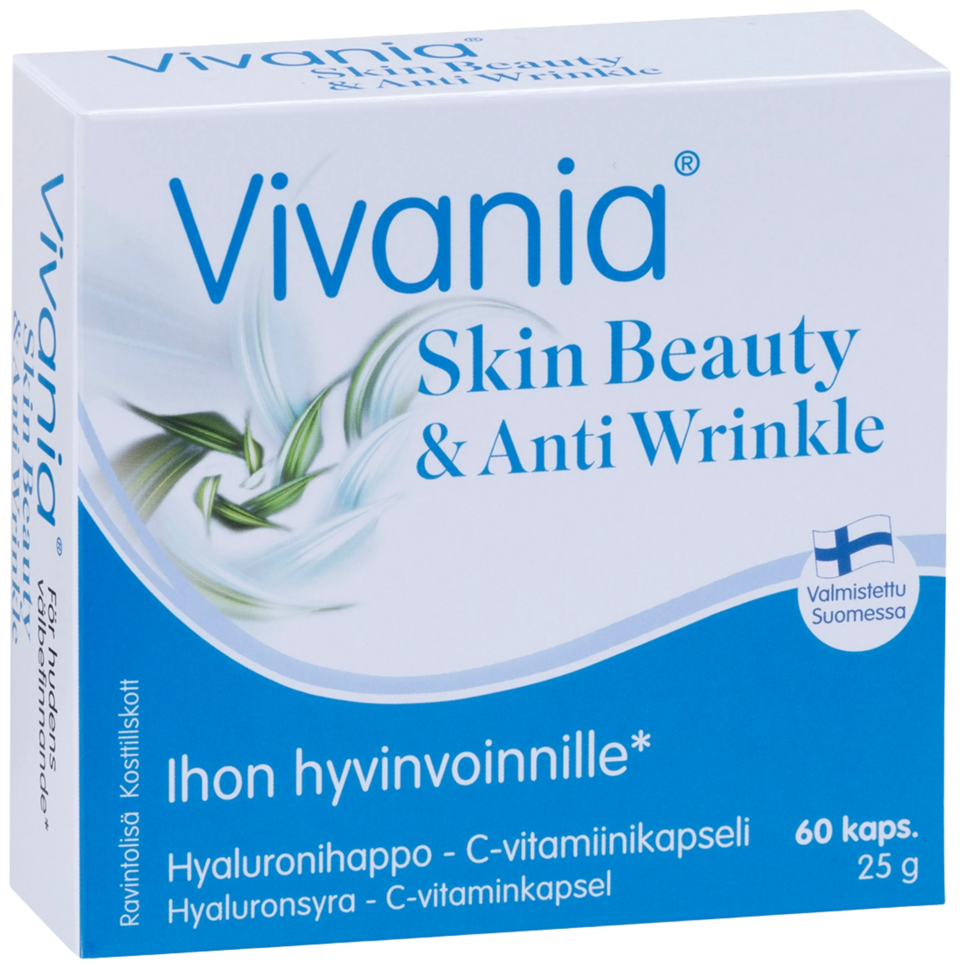 Vivania capsules contain hyaluronic acid and vitamin C, which promotes skin well-being and protects cells from oxidative stress, and participates in the formation of collagen, among other things, for the normal functioning of the skin. The product does not contain ingredients of animal origin.