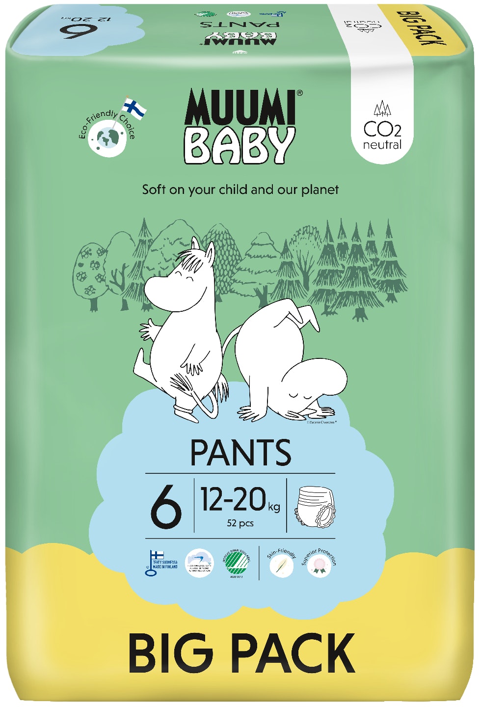 芬兰制造的Muumi婴儿拉拉裤现已实现完全碳中和!这款纸尿裤由Muumi与过敏、皮肤和哮喘协会合作研发,质地格外柔软亲肤。后侧和后腰的弹性设计确保更贴合,有效防止侧漏和后漏。高效吸收芯采用来自经认证的北欧森林的天然可降解纤维素。Muumi婴儿拉拉裤适合日夜使用。选择芬兰国产Muumi婴儿纸尿裤的理由:- 可靠、高吸收性、贴合舒适 - 芬兰本土制造,产自芬兰塔米萨里唯一的纸尿裤工厂 - 亲肤、柔软、温和的表面材料 - 碳中和,环保!我们采取切实环保行动,例如在生产过程中仅使用可再生太阳能和水力发电,并回收所有生产废料。采取这些具体行动后,剩余的少量二氧化碳排放将通过优先支持获得联合国“气候中和行动”黄金标准认证的项目来抵消——安全之选,仅采用精心挑选的纯净原材料——与过敏、皮肤和哮喘协会合作研发,不含不必要的化学物质或香料——Muumi Baby 获得天鹅标志认证,其生产过程从环境角度考虑了产品的整个生命周期——包装采用 25% 的再生塑料制成,可作为塑料回收处理。——Muumi Baby 纸尿裤提供从新生儿到幼儿的各种尺寸。Muumi Baby——呵护您的宝宝,也呵护我们的地球。